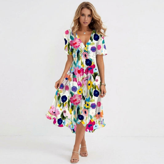 Evangelia | Vestido Midi de Gasa Floral Asimétrico y Elegante
